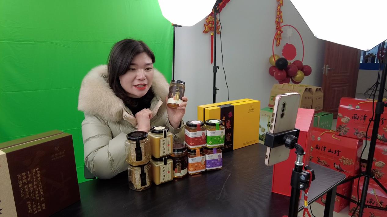 在襄阳市南漳县有机谷云上年货直播现场,带货主播正通过抖音直播间对南漳的鸡蛋、蜂蜜等优质农特产品做宣传推广。