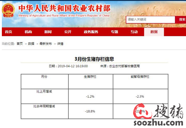 农业农村部4月12日发布最新数据,数据显示3月份生猪存栏下降18.8%,能繁母猪存栏下降21.0%。