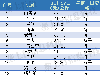 11月27日各类畜禽产品价格稳定 2019-11-27 14:36 0 声明:以上报价信息由湖北垄上行信息科技有限公司根据潜江四季友农产品批发市场、湖北浠水农产品批发市场综合整理,可能与各地实际情况有所出入,仅供参考。转载请注明来源。