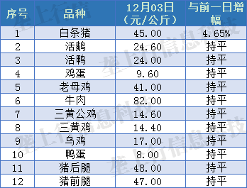 12月03日白条猪小幅上涨,其他品种价格稳定 2019-12-03 14:20 0 声明:以上报价信息由湖北垄上行信息科技有限公司根据潜江四季友农产品批发市场综合整理,可能与各地实际情况有所出入,仅供参考。转载请注明来源。