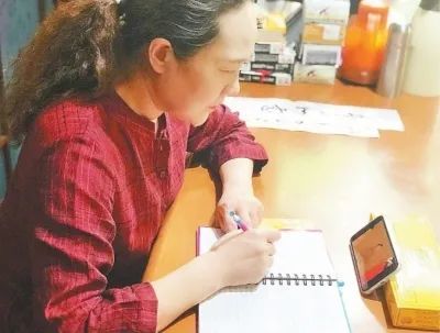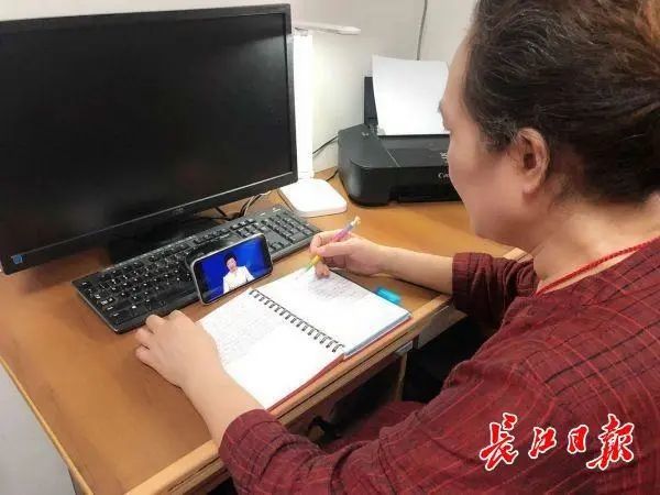 万雪琴坐在沙发或餐桌边看网课