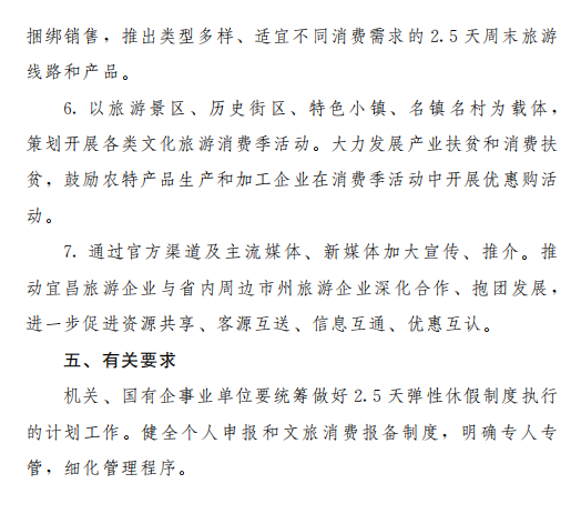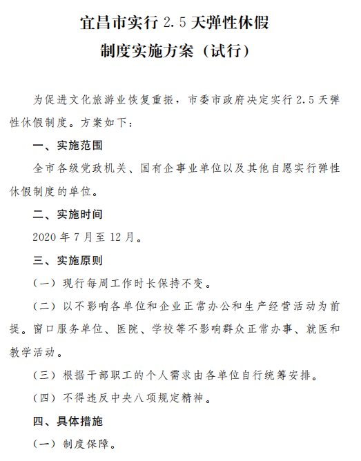日前,宜昌市人民政府办公室印发《宜昌市实行2.5天弹性休假制度实施方案(试行)》的通知。《通知》明确,为促进文化旅游业恢复重振,市委、市政府决定实行2.5天弹性休假制度。方案如下: