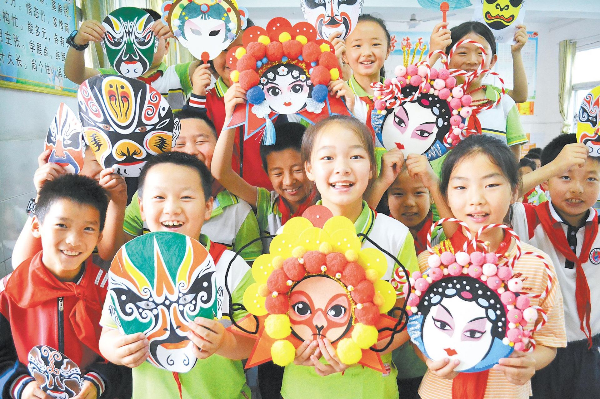 6月9日,十堰市郧阳区柳陂小学学生们正在展示手工制作的“京剧脸谱”。当日,该校举行“非遗”进课堂活动,小学生们在老师指导下,精心绘制京剧脸谱、传统风车、捏面塑等,感受传统文化的魅力,迎接第五个中国“文化和自然遗产日”(每年6月的第二个星期六)。