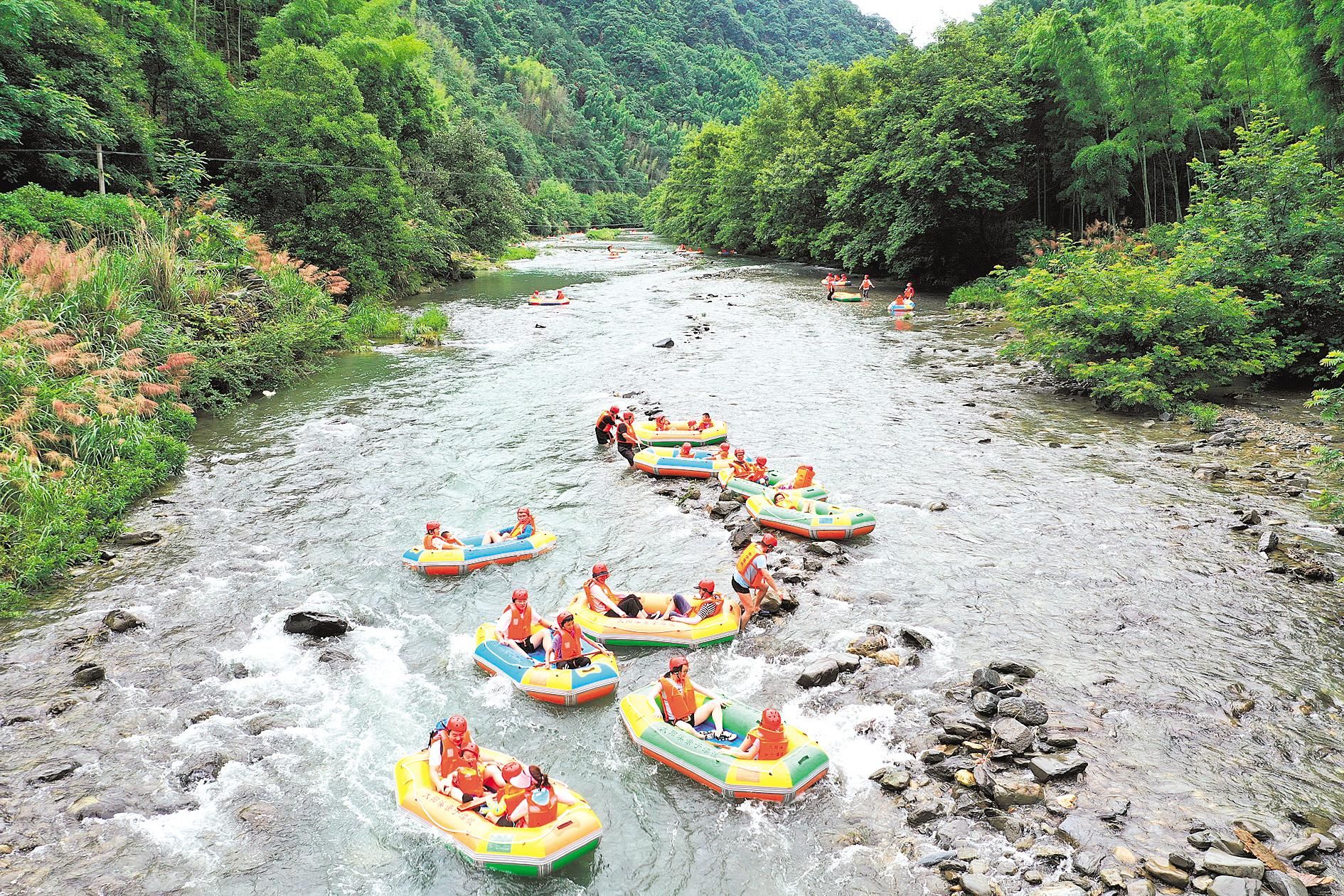 6月13日,游客在咸宁市通山县厦铺镇太阳溪体验亲子漂流。端午节假期,咸宁各景区和乡村旅游景点人气升温,游客接待量持续增高,漂流项目吸引大批来自周边武汉、黄石等地的游客。