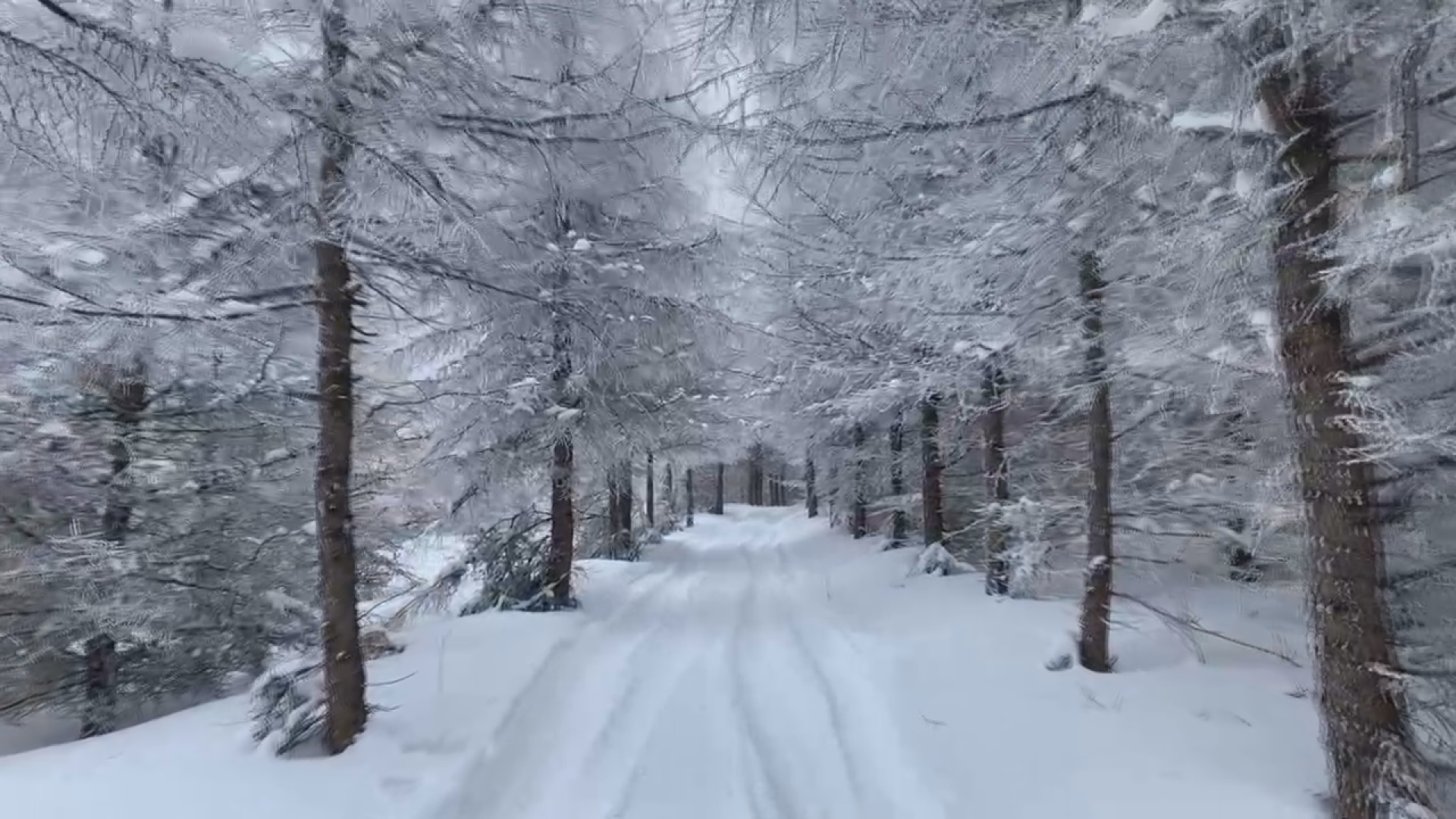 雪后的林海,呈现出千树万树梨花开的别样景观,林中道路被积雪覆盖,犹如一条白色地毯,向森林深处延伸,驾驶雪地车穿梭其中,仿佛置身于童话世界。