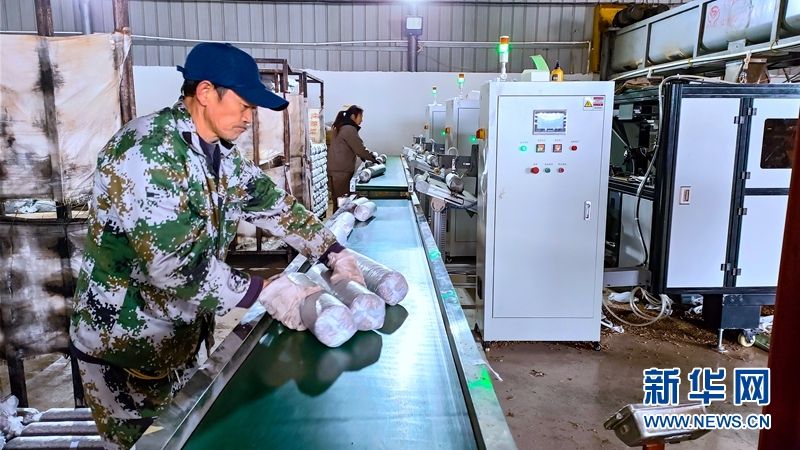 东巩镇裕农菌业加工车间内,工人们正在整理摆放加工好的香菇菌棒