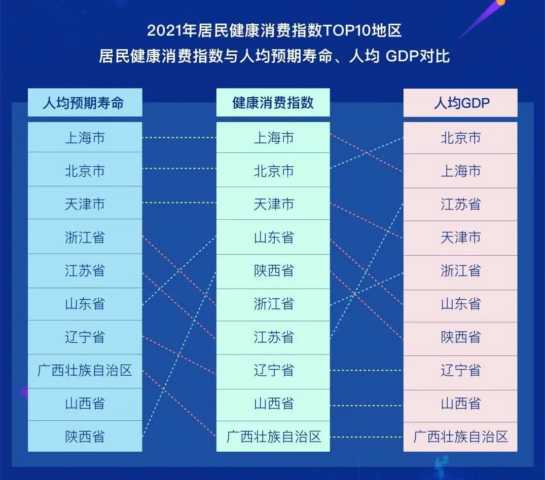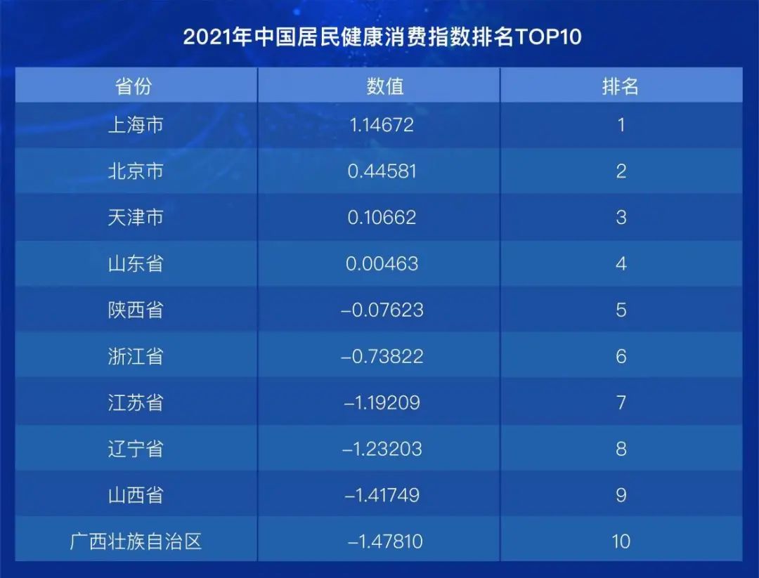 报告显示,2021年度居民健康消费指数排名,上海、北京、天津在31个省(直辖市、自治区)中位居前三。