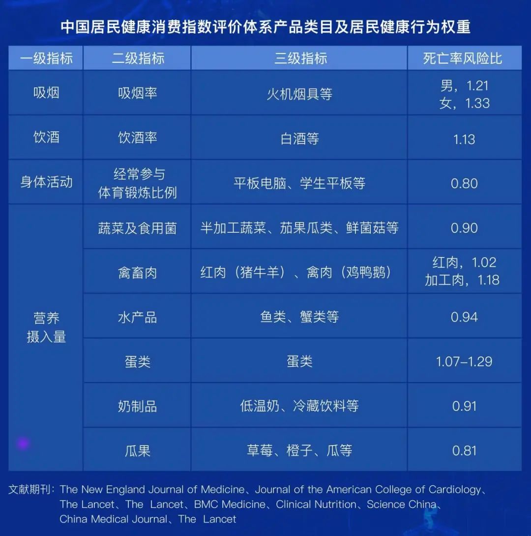 居民健康消费指数旨在使用消费大数据衡量居民消费习惯对健康程度的影响。通过计算居民平均每日消耗蔬菜水果、肉蛋奶、烟酒等商品以及身体活动时间的具体数值,参考权威医学实证研究得出居民消费行为对于健康的影响系数,进而推算得来。