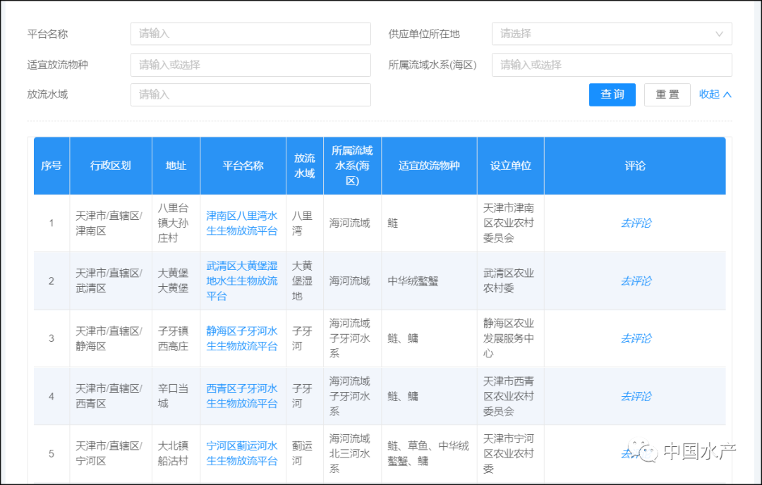“智能渔技”综合信息服务平台网站首页社会公众可以登录全国水产技术推广总站“智能渔技”综合信息服务平台,在首页“数据查询”板块下,点击“水生生物定点放流平台查询”即可查询已公布的水生生物增殖放流苗种供应基地和水生生物定点放流场所信息。