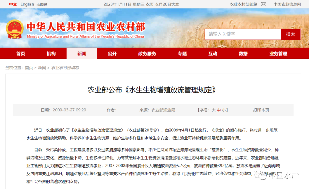 2009年农业部颁布了《水生生物增殖放流管理规定》(农业部第20号令),明确了社会单位和个人开展增殖放流活动的管理要求需要注意的是,根据《水生生物增殖放流管理规定》,单位和个人自行开展规模性水生生物增殖放流活动的,应当提前15日向当地县级渔业主管部门报告增殖放流的种类、数量、规格、时间和地点等事项,接受监督检查。如果有其它具体问题,也可按照平台公布的相关电话进一步咨询,以便在当地渔业主管部门监督指导下,合法合规开展水生生物放流(放生)活动,让善念、善行真正结成善缘、善果。