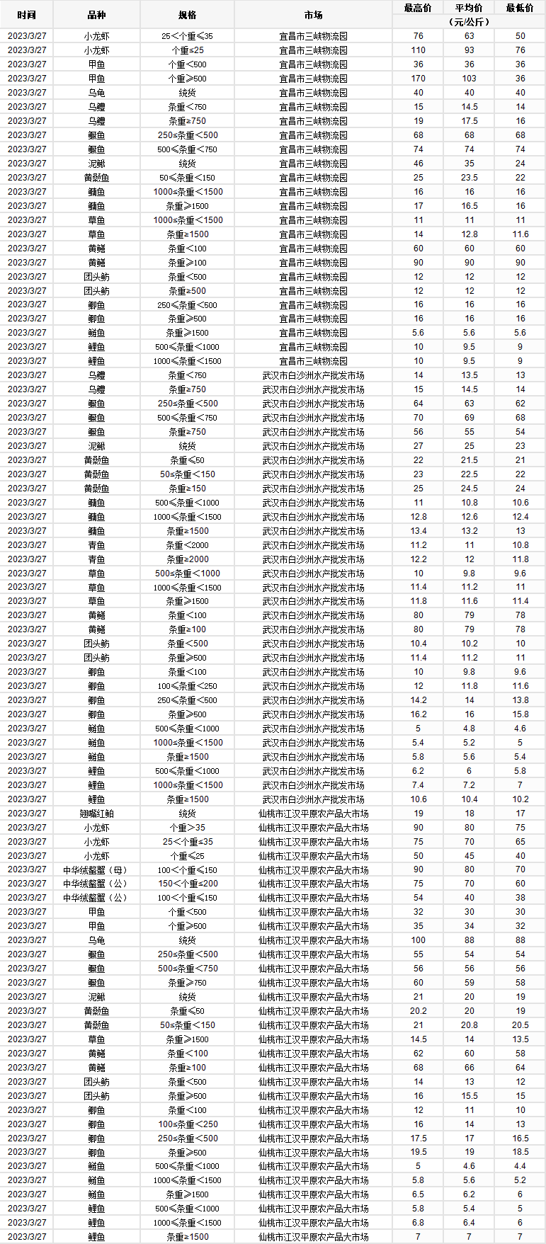 2023年3月27日 行情|湖北省主要水产品价格明细