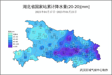 图1 湖北省2023年4月17-23日累计降水量分布图(毫米)