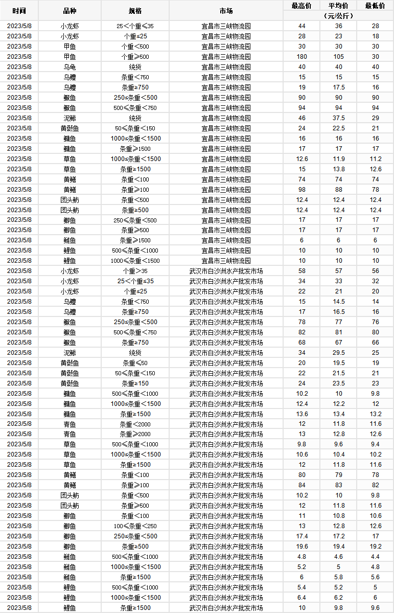 2023年5月8日 行情|湖北省主要水产品价格明细