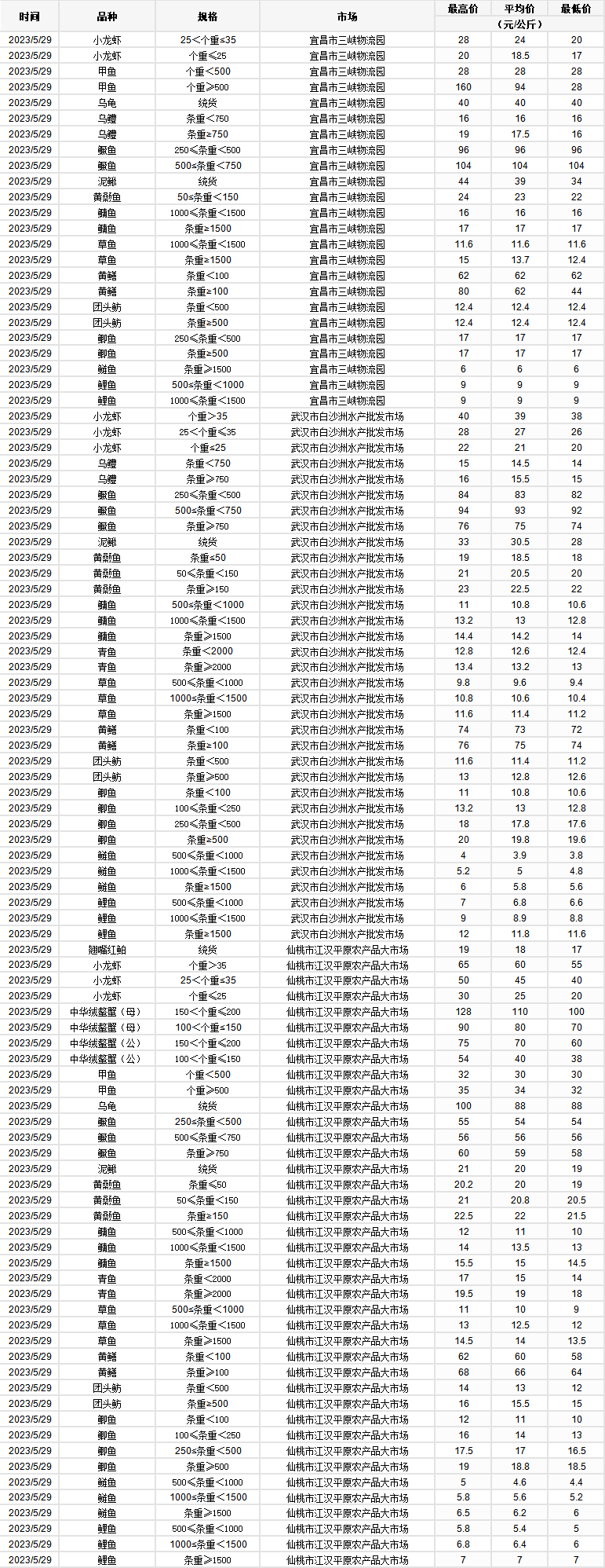 2023年5月29日 行情|湖北省主要水产品价格明细