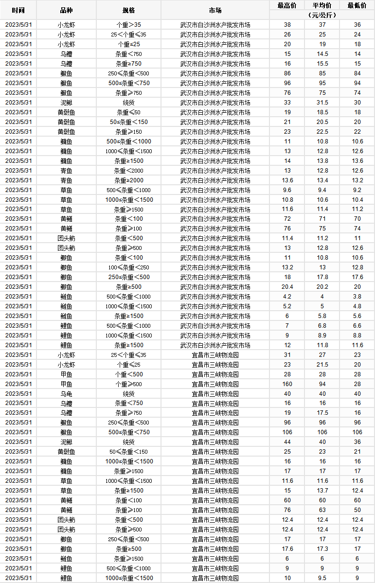 2023年5月31日 行情|湖北省主要水产品价格明细