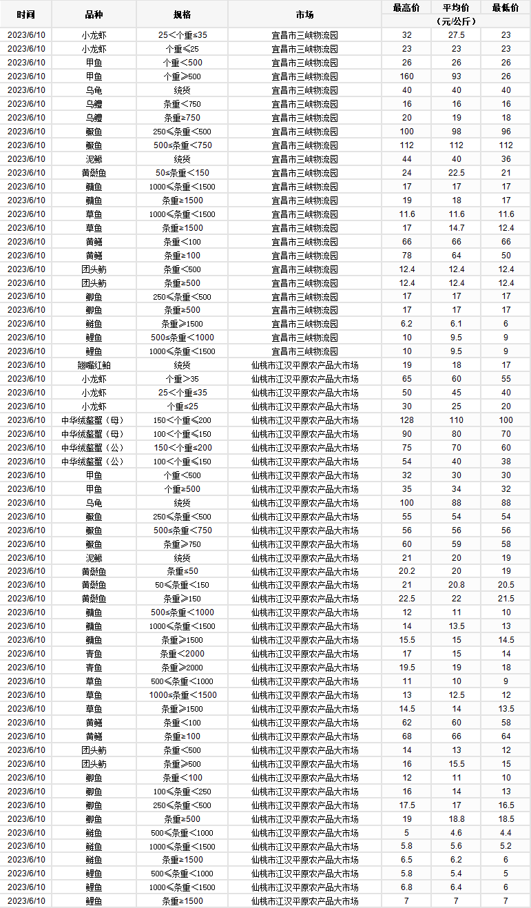 2023年6月10日 行情|湖北省主要水产品价格明细