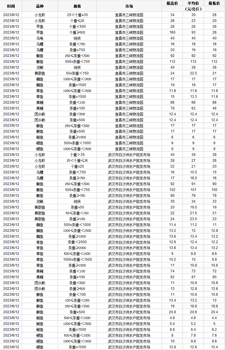2023年6月12日 行情|湖北省主要水产品价格明细