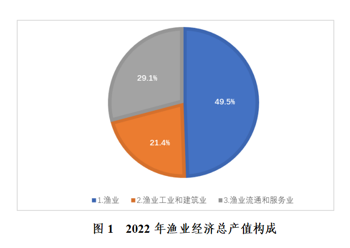 按当年价格计算,全社会渔业经济总产值30873.14亿元,其中,渔业产值15267.49亿元,渔业工业和建筑业产值6621.17亿元,渔业流通和服务业产值8984.48亿元,三个产业产值的比例为49.5∶21.4∶29.1,如图1所示。渔业流通和服务业产值中,休闲渔业产值847.40亿元,同比上升1.42%。