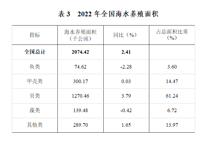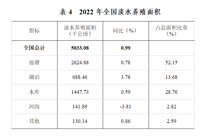 2022年,全国水产养殖面积7107.50千公顷,同比增长1.40%。其中,海水养殖面积2074.42千公顷,同比增长2.41%;淡水养殖面积5033.08千公顷,同比增长0.99%;海水养殖与淡水养殖的面积比例为29.2∶70.8,如表3、表4所示。