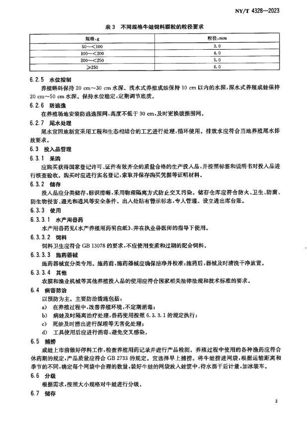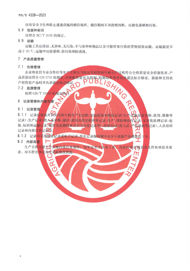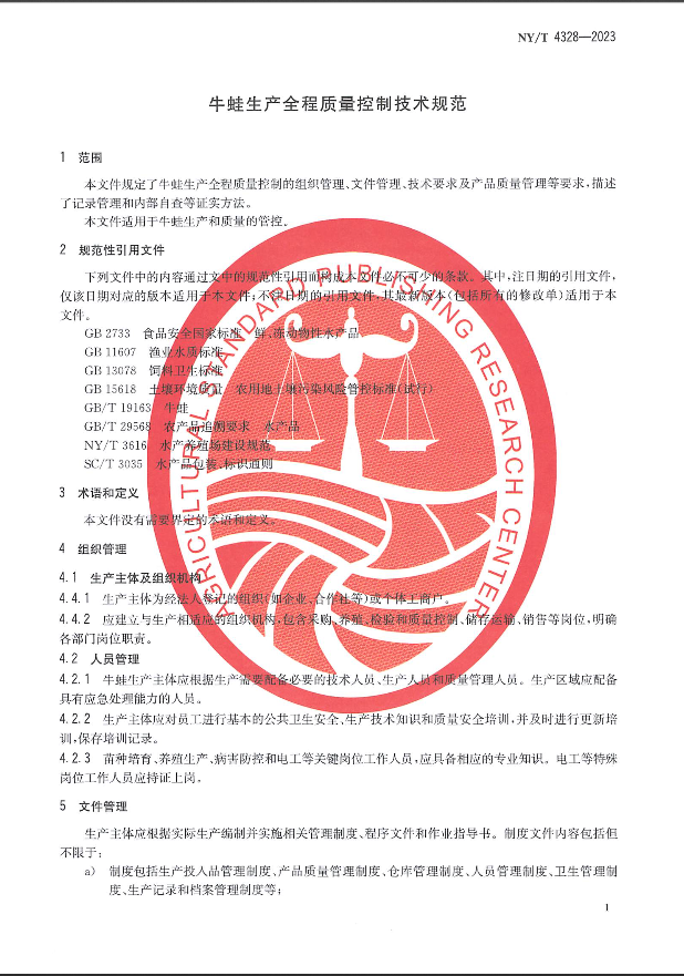 近年来,牛蛙餐饮业十分火爆,消费需求快速增长,但在养殖环节,牛蛙屡屡遭到清拆。其根本原因,是牛蛙行业缺乏相关的行业标准和技术规范,导致生产不规范、不合理,引发污染和药残等一系列问题。针对行业问题,珠江水产研究所联合中国科学院水生生物研究所、广州观星农业科技有限公司、华南农业大学、湖南大学、中国农业大学等八所院校和单位的专家团队共同起草、联合制定了《牛蛙生产全程质量控制技术规范》(NY/T4328-2023),该标准由农业农村部2023年4月11日颁布,8月1日实施。牛蛙行业有了具体的技术指标和要求,可指导养殖户合规生产,改善牛蛙行业的无序现状,建立起符合现代经营理念和科技水平的标准化生产工艺流程,提高牛蛙产品的产品质量和安全性,促进产业的高质量发展。