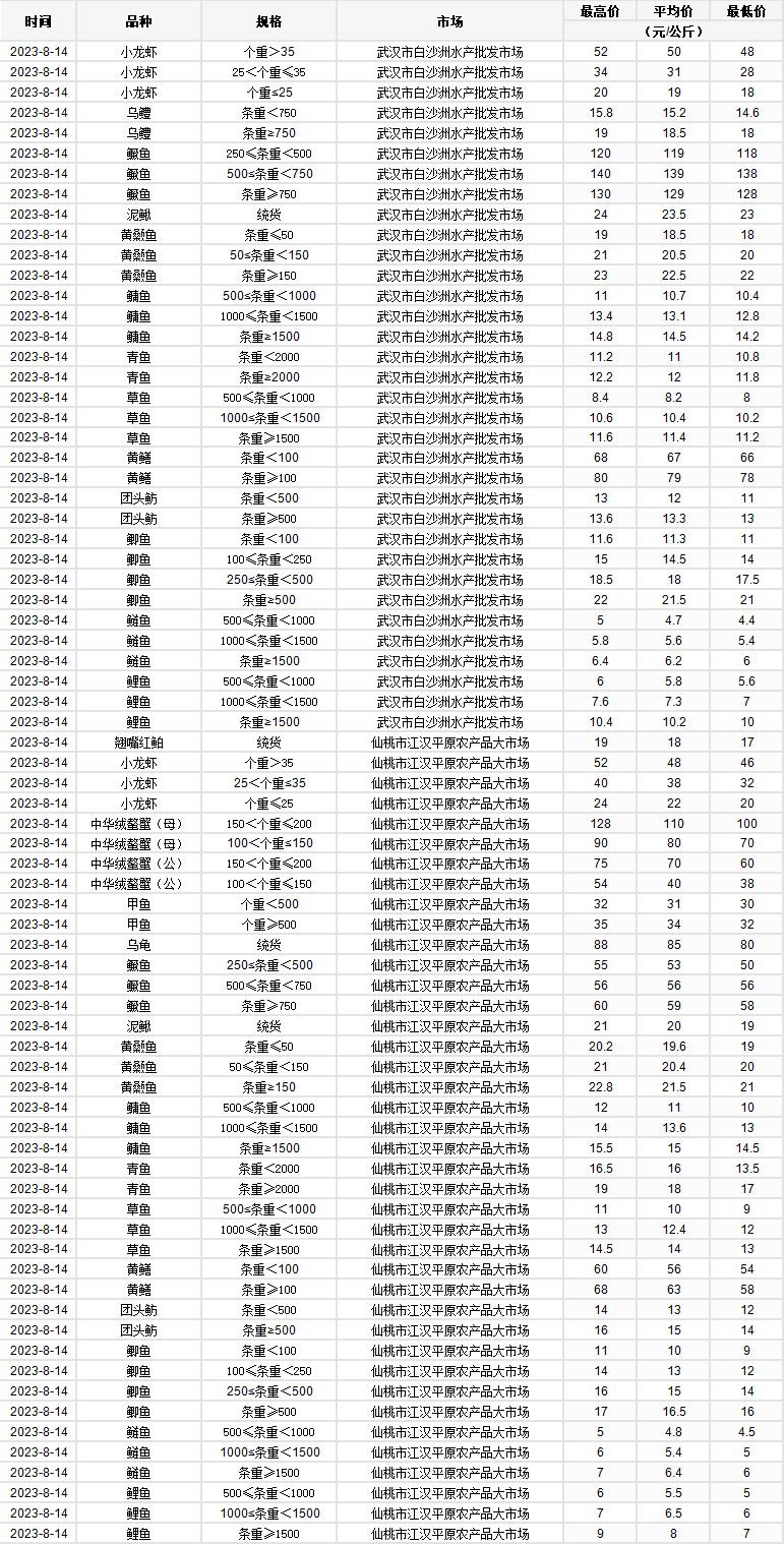 2023年8月14日 行情|湖北省主要水产品价格明细