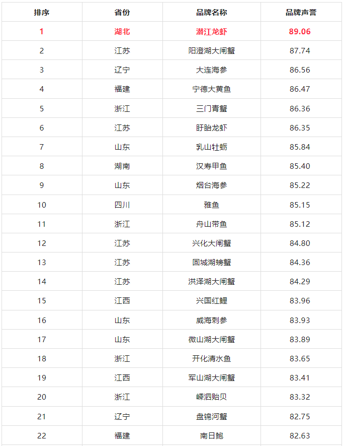 近日,“2022中国地理标志农产品(水产)品牌声誉前100位”名单公布,潜江龙虾入选位居榜首,此外湖北还有丹江口翘嘴鲌、笔架鱼肚、洈水刁子鱼、涨渡湖黄颡鱼、梁子湖大河蟹入选榜单。
