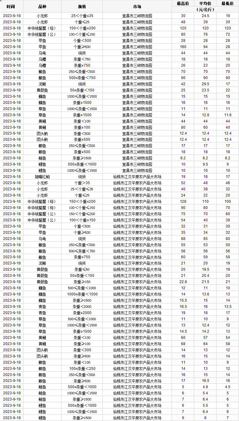2023年9月18日 行情|湖北省主要水产品价格明细