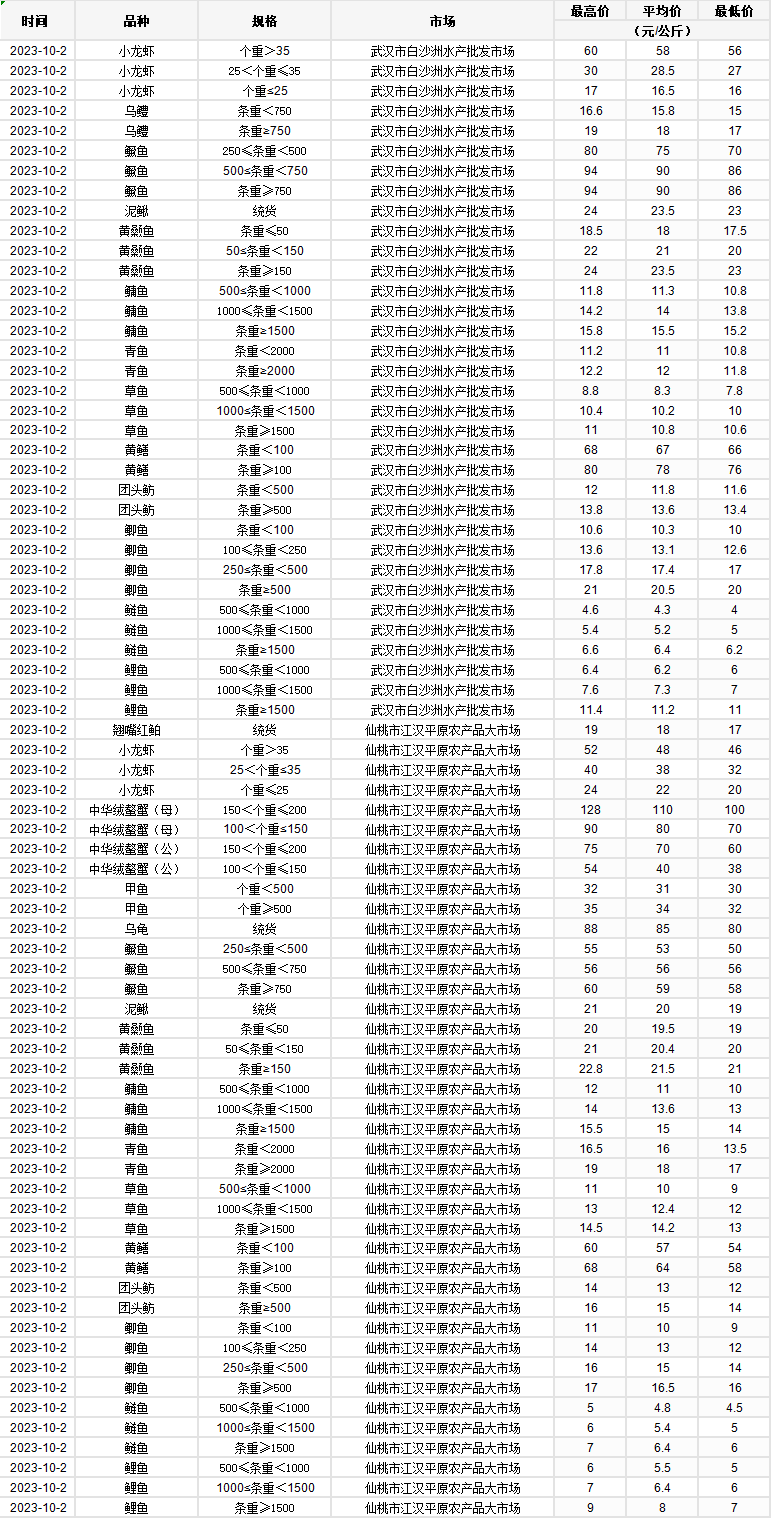 2023年10月2日 行情|湖北省主要水产品价格明细