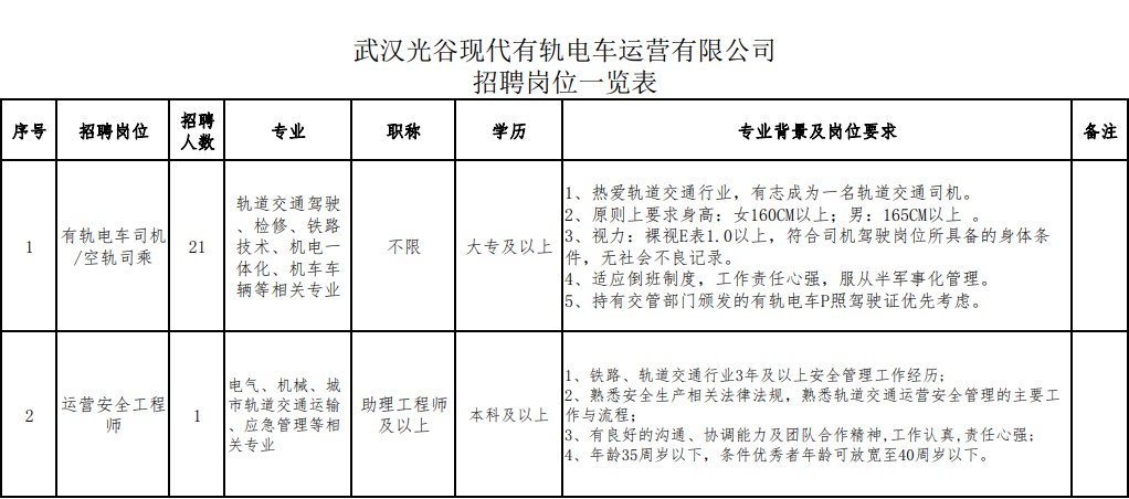 目前,光谷空轨旅游线已于9月26日开通运营,有轨电车L3线计划开通,现面向全国招聘运营管理人才。本次共招聘2个岗位共22人。
