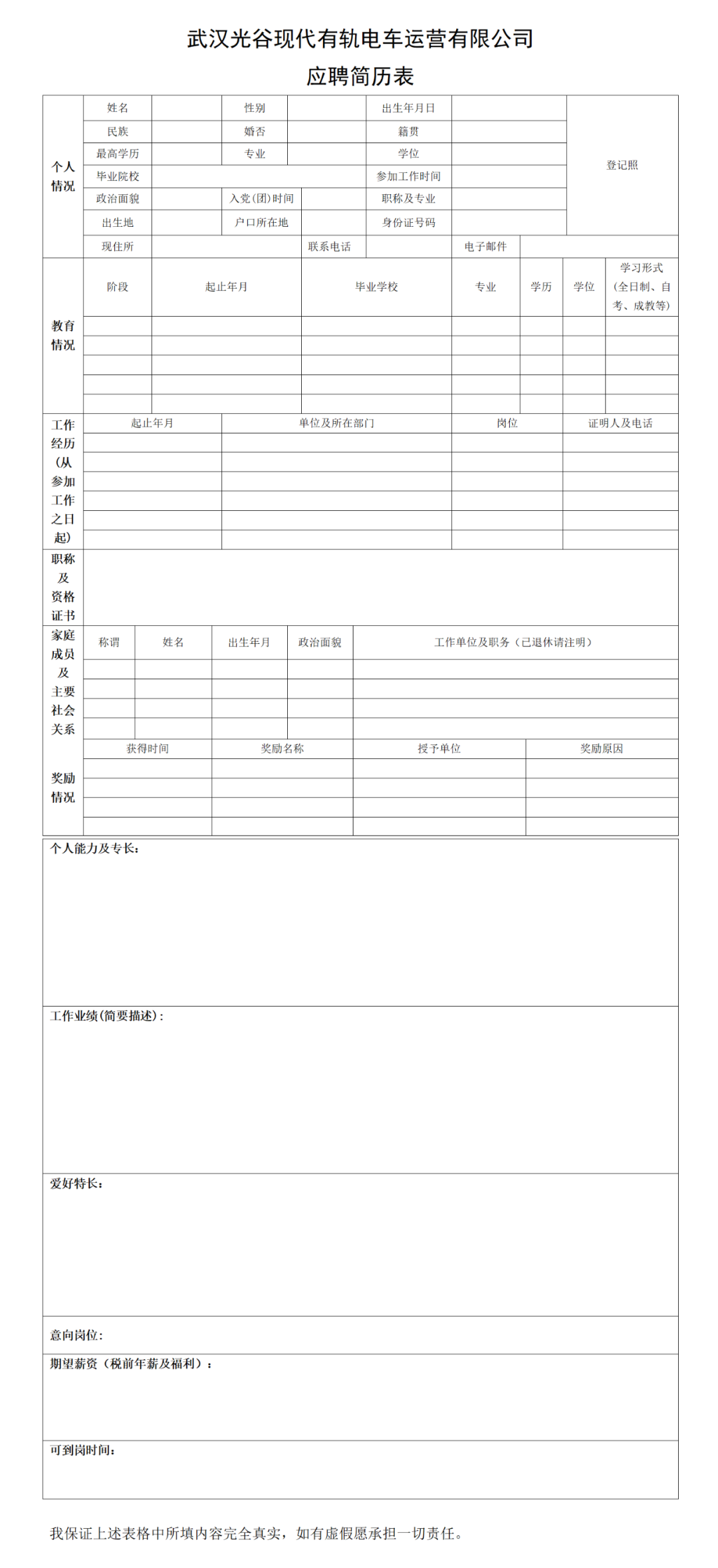 应聘人员需下载简历表填写:《武汉光谷现代有轨电车运营有限公司应聘简历表》,并以附件word形式连同资格审核材料(学历学位证书扫描件、学历及学位认证报告扫描件、职称证书扫描件、任职及业绩证明文件扫描件等)一并发送至邮箱whggjtjs@163.com,并在邮件标题中注明“姓名+岗位”;学历及学位认证报告以中国高等教育学生信息网(https://www.chsi.com.cn/)出具的《中国高等教育学历认证报告》及《中国高等教育学位认证报告》为准。