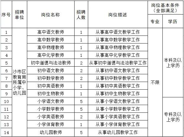 教育教学岗位:主要面向全日制一本及以上学历学位、或公费师范毕业生、或国外知名高校硕士研究生及以上学历的毕业生,特殊岗位可放宽到全日制本科学历。