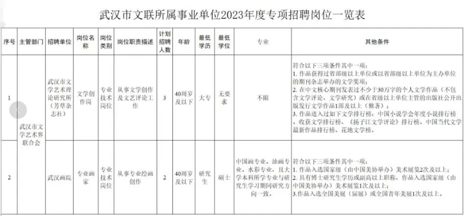 此次专项招聘共5人,其中,武汉市文学艺术理论研究所(芳草杂志社)招聘3人,武汉画院招聘2人。具体岗位详情详见下表。