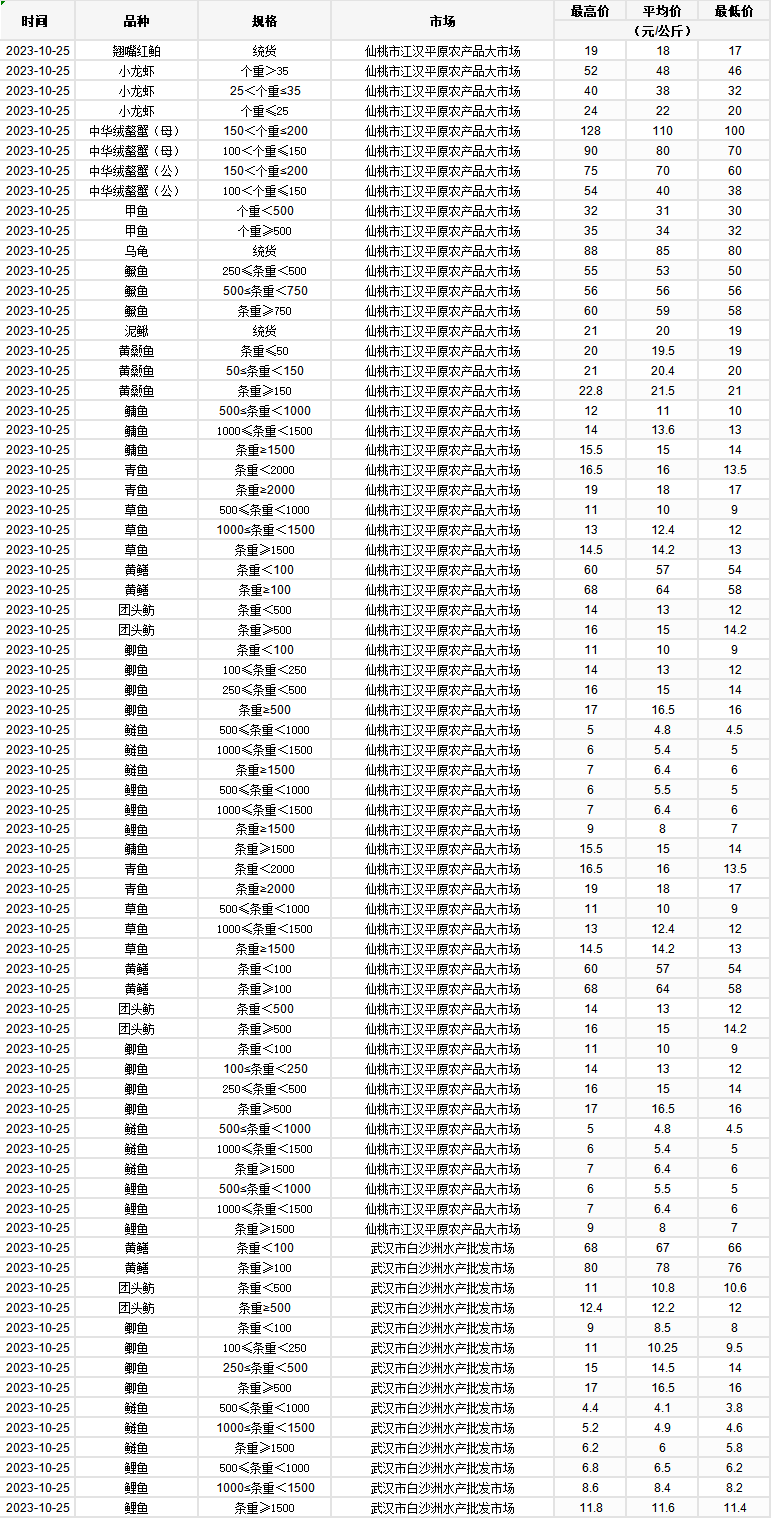 2023年10月25日 行情|湖北省主要水产品价格明细