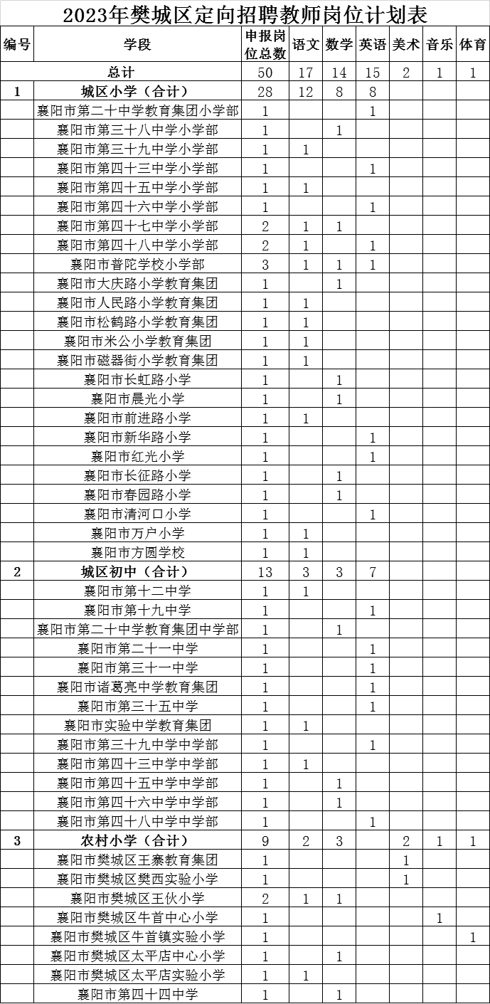 根据《事业单位公开招聘人员暂行规定》(原人事部令第6号)和省教育厅、省委编办、省财政厅、省人社厅《关于进一步加强新时代中小学教师队伍建设管理的若干意见》(鄂教师﹝2021﹞1号)文件精神,现将2023年樊城区定向招聘教师有关事项公告如下:
