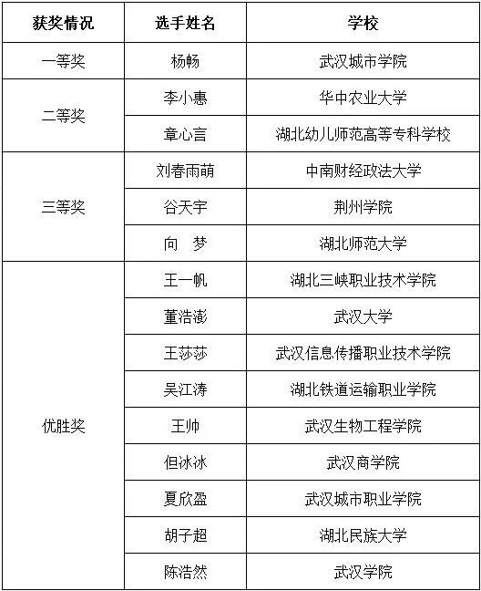 大赛自启动以来,吸引了全省81所高校的4万余名大学生的积极参与。经过激烈的角逐,最终来自武汉城市学院的杨畅荣获一等奖,来自华中农业大学的李小惠、湖北幼儿师范高等专科学校的章心言荣获二等奖,中南财经政法大学的刘春雨萌、荆州学院的谷天宇、湖北师范大学的向梦荣获三等奖。