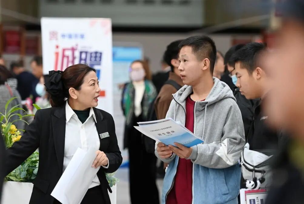 2023年11月10日,天津,求职者在招聘会现场与用人单位交流。新华社记者 赵子硕 摄