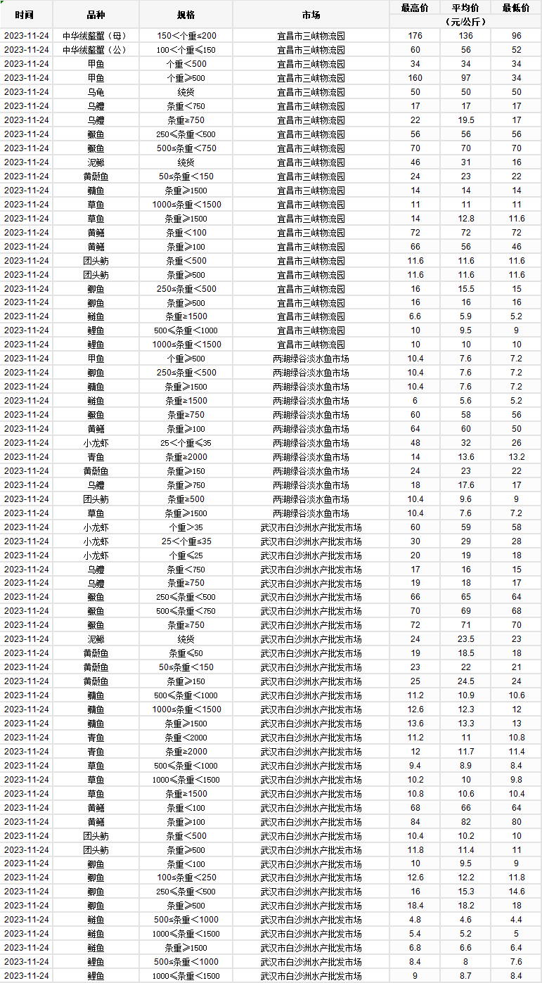 2023年11月24日 行情|湖北省主要水产品价格明细