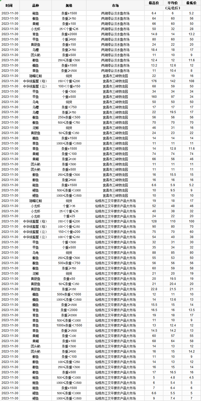 2023年11月30日 行情|湖北省主要水产品价格明细