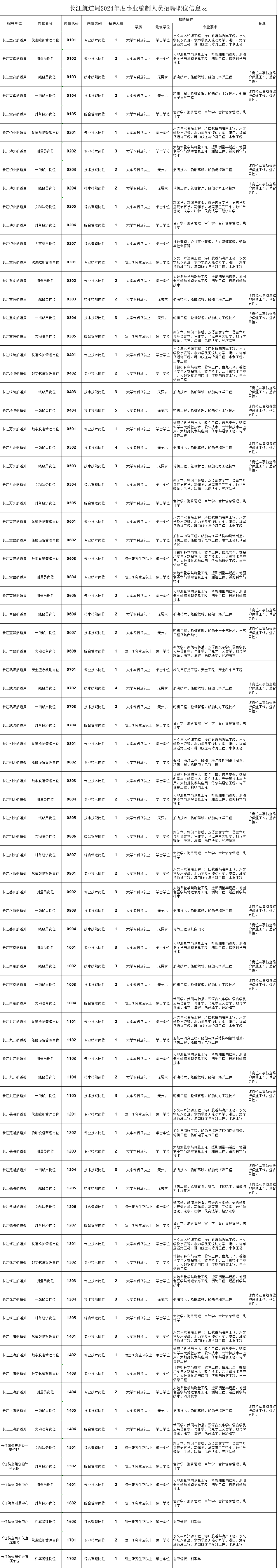 此次发布2024年度招聘计划的单位包括:长江宜宾航道局、长江泸州航道局、长江重庆航道局、长江涪陵航道处、长江万州航道处、长江宜昌航道局、长江荆州航道处、长江岳阳航道处、长江武汉航道局、长江九江航道处、长江芜湖航道处、长江南京航道局、长江镇江航道处、长江上海航道处、长江航道测量中心、长江航道规划设计研究院、长江航道局机关直属单位,拟招聘事业编制人员140人。