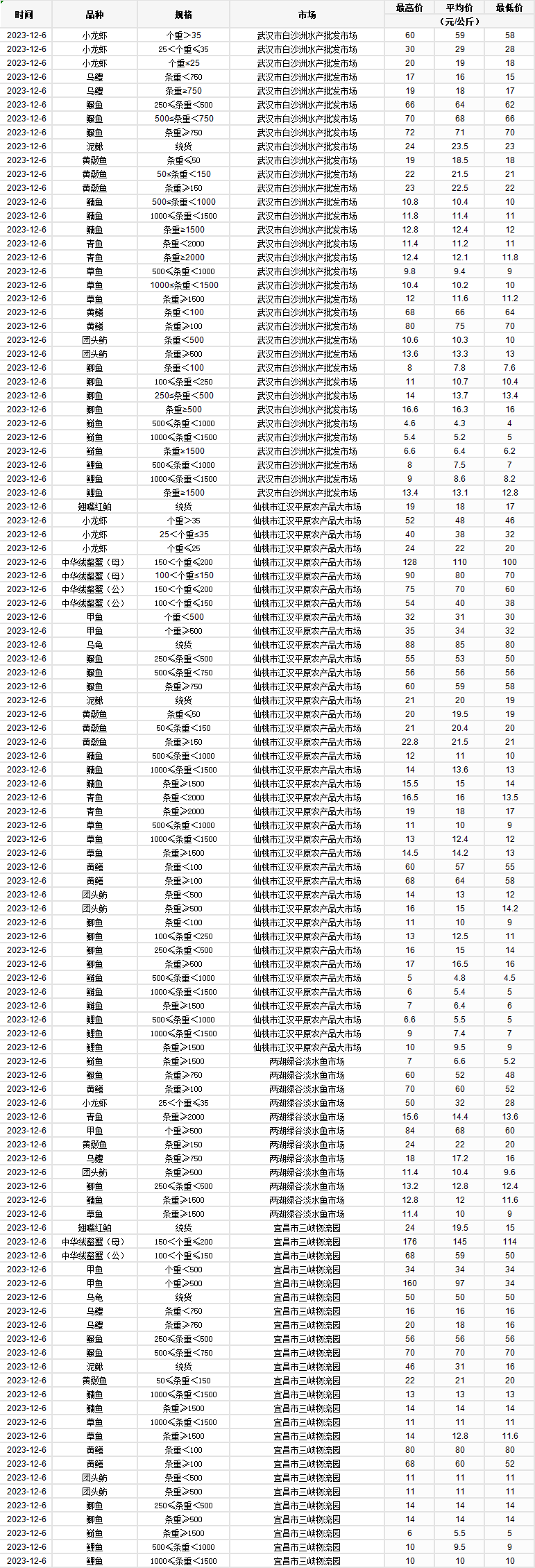 2023年12月6日 行情|湖北省主要水产品价格明细