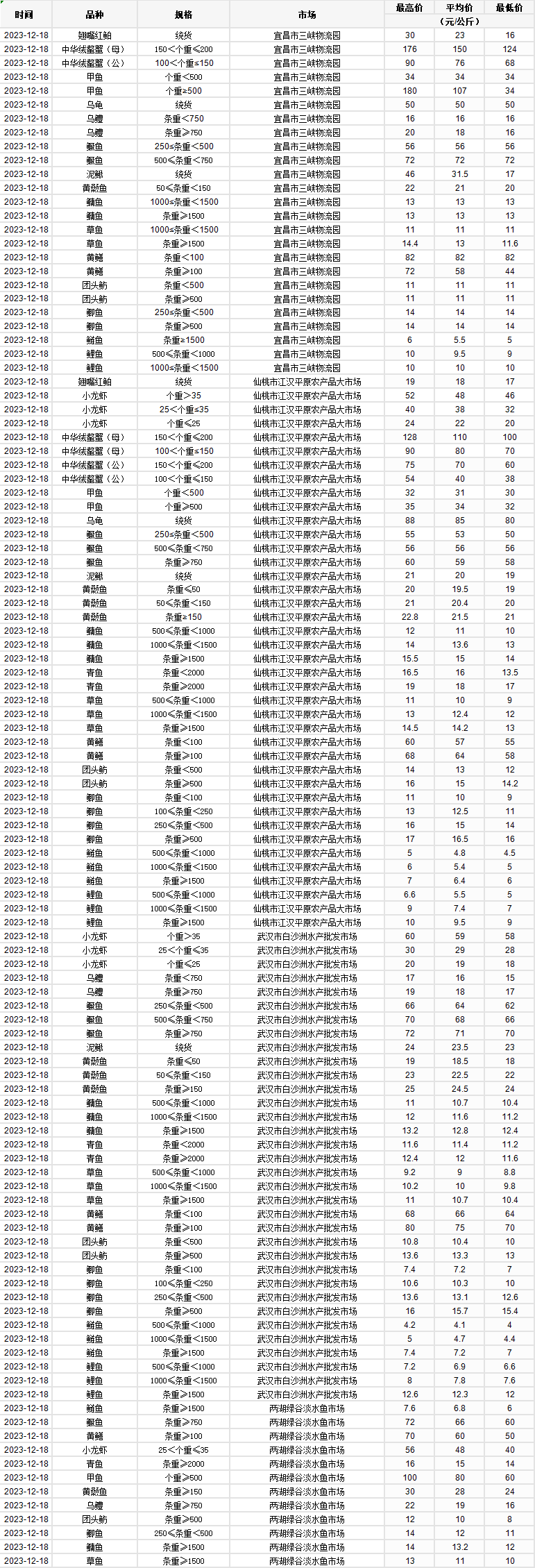 2023年12月18日 行情|湖北省主要水产品价格明细