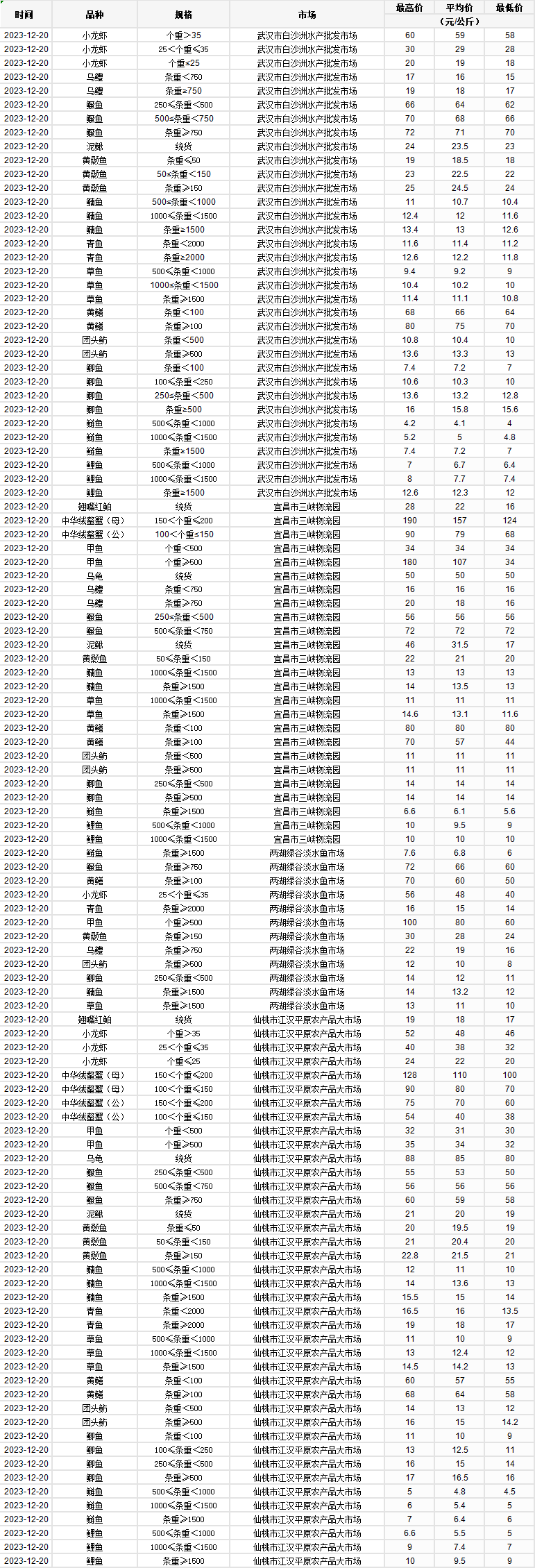 2023年12月20日 行情|湖北省主要水产品价格明细