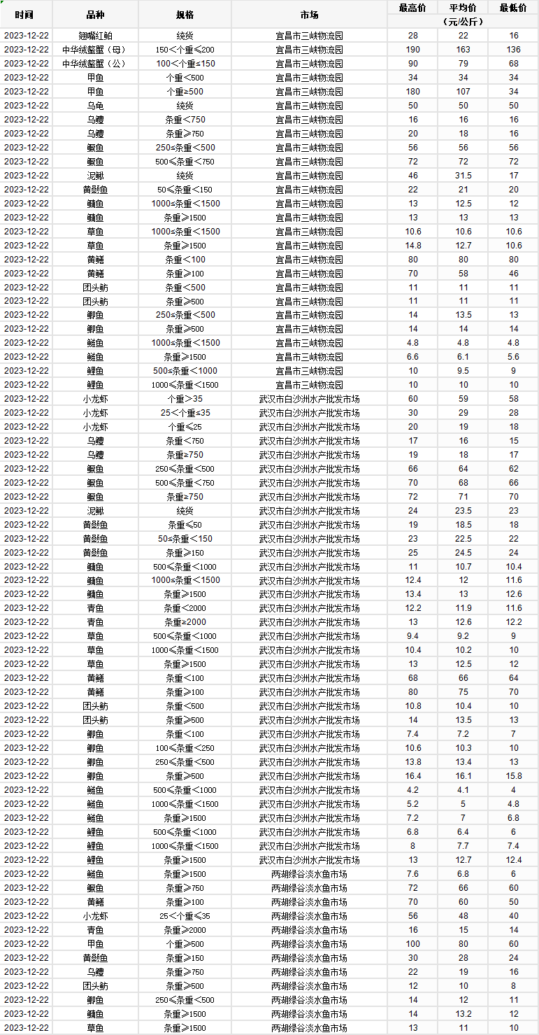 2023年12月22日 行情|湖北省主要水产品价格明细