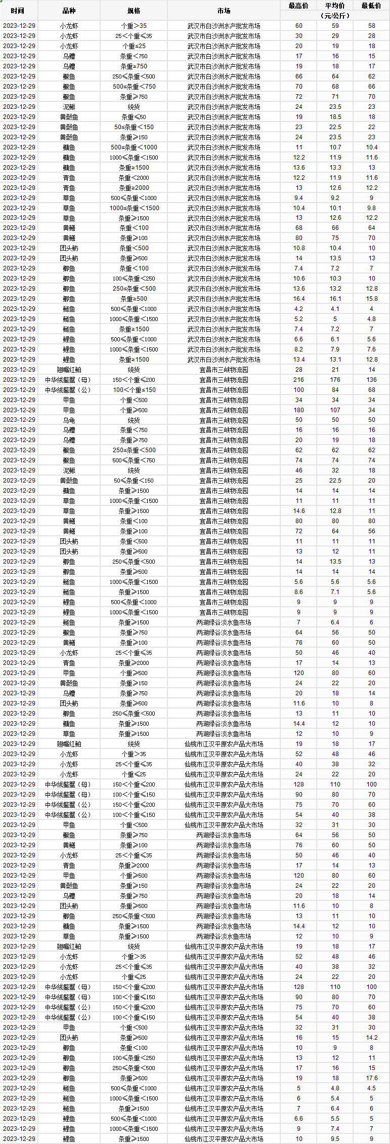 2023年12月29日 行情|湖北省主要水产品价格明细