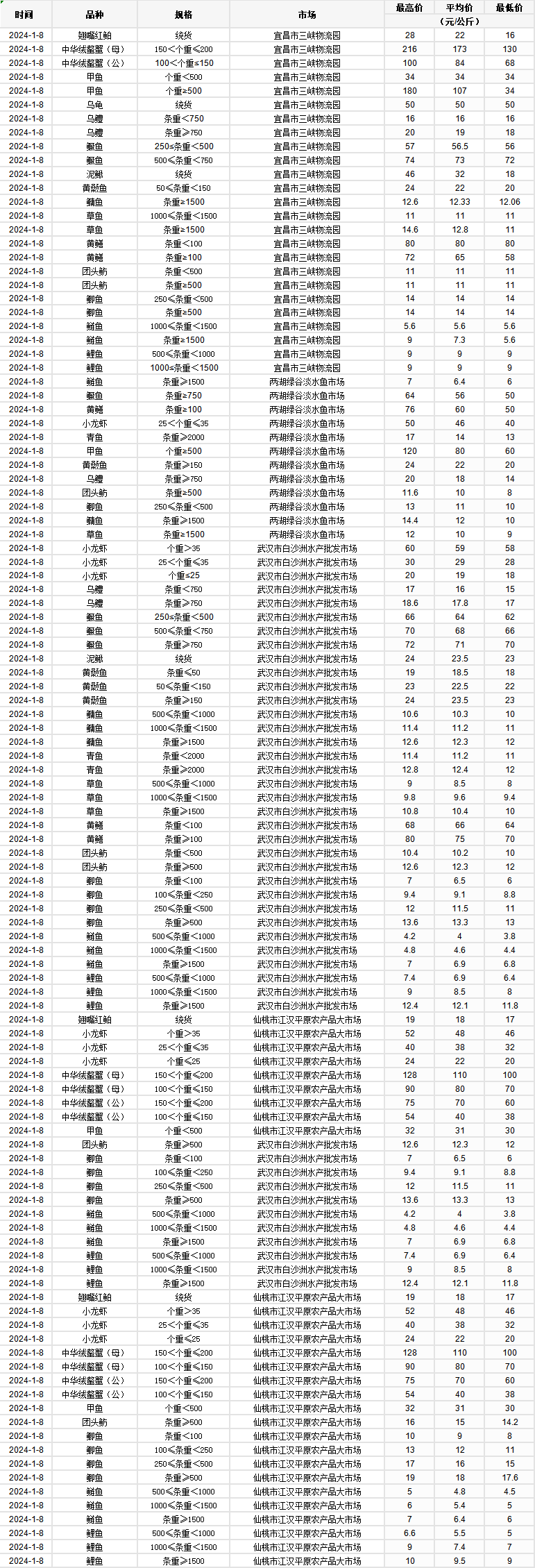 2024年1月8日 行情|湖北省主要水产品价格明细