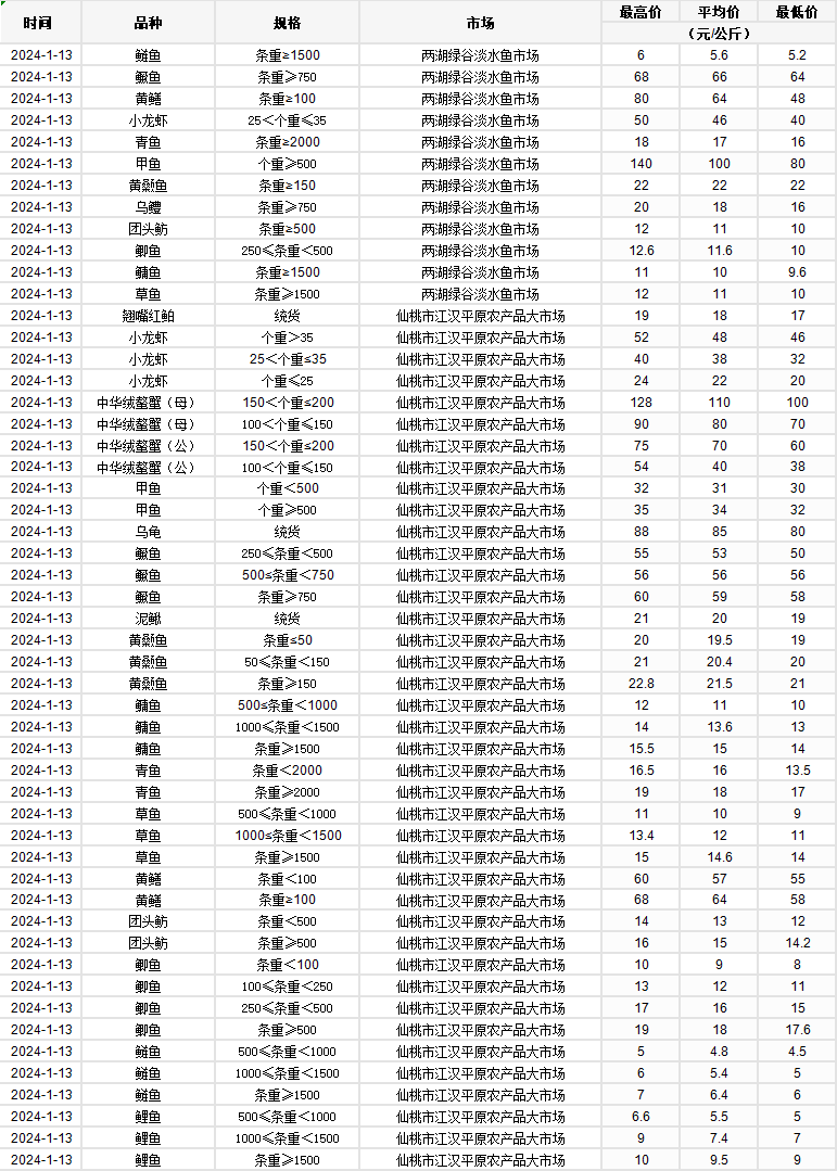 2024年1月13日 行情|湖北省主要水产品价格明细