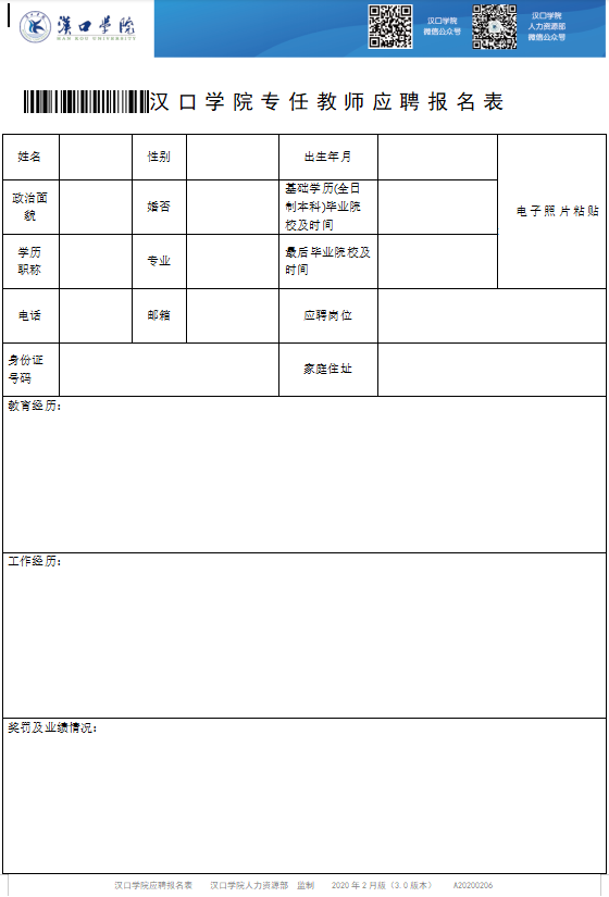 有意应聘者将个人简历电子版(含相关证书扫描件)及《汉口学院应聘报名表》(官网下载)以“姓名+应聘岗位”的形式命名,发送至电子邮箱hkxyrlzyb@163.com,经资格审查后,面试时间另行通知。