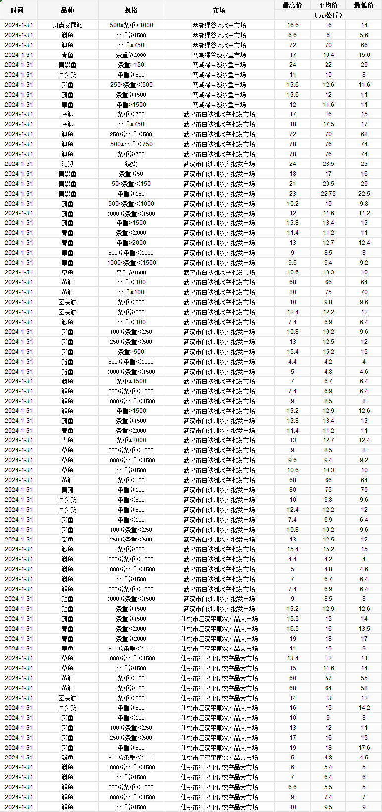 2024年1月31日 行情|湖北省主要水产品价格明细