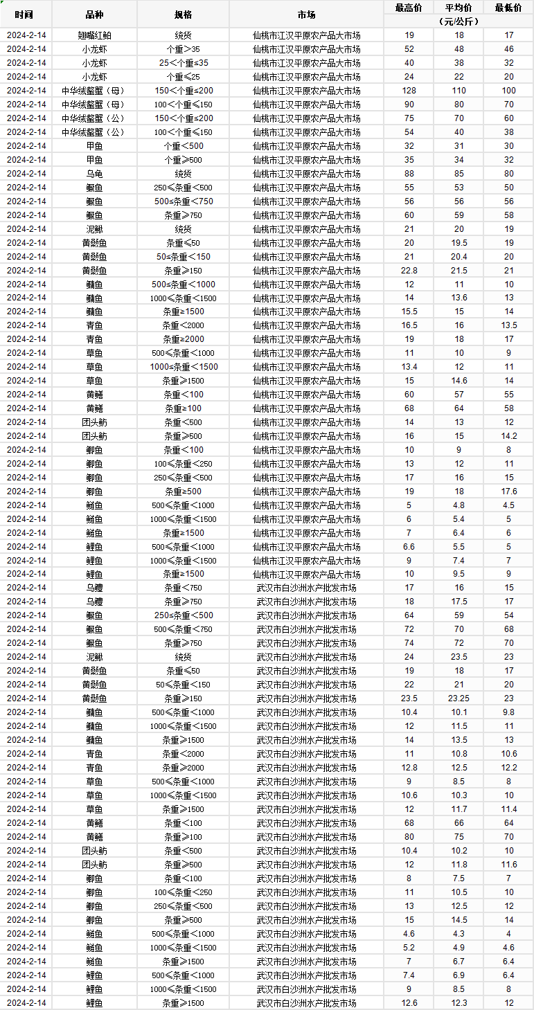 2024年2月14日 行情|湖北省主要水产品价格明细