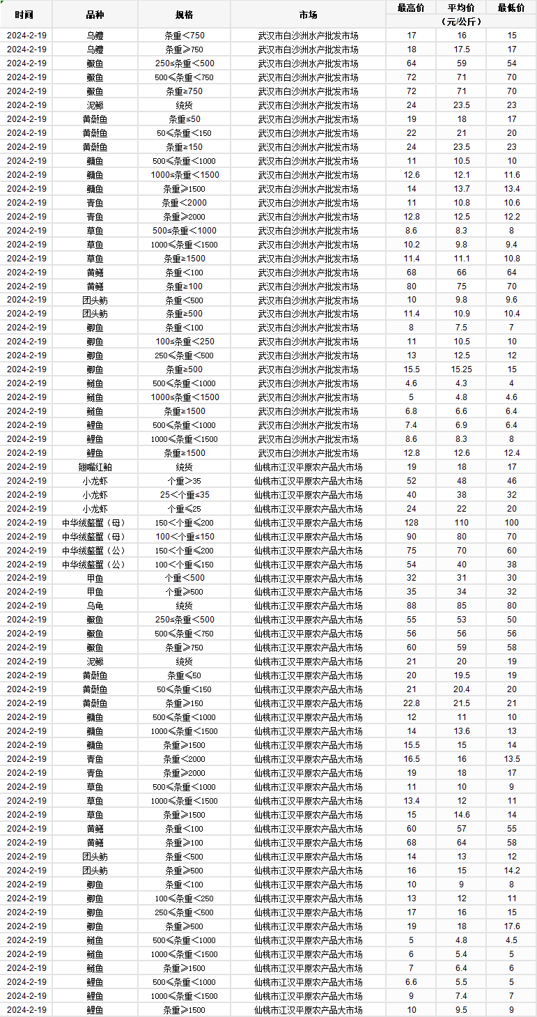 2024年2月19日 行情|湖北省主要水产品价格明细